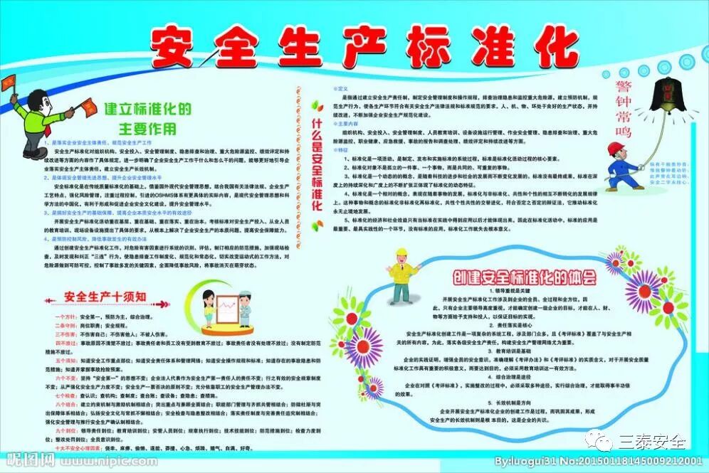 三、開展安全生產(chǎn)標(biāo)準(zhǔn)化建設(shè)的意義 《國務(wù)院安委會關(guān)于深入開展企業(yè)安全生產(chǎn)標(biāo)準(zhǔn)化建設(shè)的指導(dǎo)意見》(安委〔2011〕4號)中指出,開展安全生產(chǎn)標(biāo)準(zhǔn)化的意義在于: (一) 是落實(shí)企業(yè)安全生產(chǎn)主體責(zé)任的必要途徑。國家有關(guān)安全生產(chǎn)法律法規(guī)和規(guī)定明確要求,要嚴(yán)格企業(yè)安全管理,全面開展安全達(dá)標(biāo)。企業(yè)是安全生產(chǎn)的責(zé)任主體,也是安全生產(chǎn)標(biāo)準(zhǔn)化建設(shè)的主體,要通過加強(qiáng)企業(yè)每個(gè)崗位和環(huán)節(jié)的安全生產(chǎn)標(biāo)準(zhǔn)化建設(shè),不斷提高安全管理水平,促進(jìn)企業(yè)安全生產(chǎn)主體責(zé)任落實(shí)到位。 (二)是強(qiáng)化企業(yè)安全生產(chǎn)基礎(chǔ)工作的長效制度。安全生產(chǎn)標(biāo)準(zhǔn)化建設(shè)涵蓋了增強(qiáng)人員安全素質(zhì)、提高裝備設(shè)施水平、改善作業(yè)環(huán)境、強(qiáng)化崗位責(zé)任落實(shí)等各個(gè)方面,是一項(xiàng)長期的、基礎(chǔ)性的系統(tǒng)工程,有利于全面促進(jìn)企業(yè)提高安全生產(chǎn)保障水平。 (三)是政府實(shí)施安全生產(chǎn)分類指導(dǎo)、分級監(jiān)管的重要依據(jù)。實(shí)施安全生產(chǎn)標(biāo)準(zhǔn)化建設(shè)考評,將企業(yè)劃分為不同等級,能夠客觀真實(shí)地反映出各地區(qū)企業(yè)安全生產(chǎn)狀況和不同安全生產(chǎn)水平的企業(yè)數(shù)量,為加強(qiáng)安全監(jiān)管提供有效的基礎(chǔ)數(shù)據(jù)。 (四)是有效防范事故發(fā)生的重要手段。深入開展安全生產(chǎn)標(biāo)準(zhǔn)化建設(shè),能夠進(jìn)一步規(guī)范從業(yè)人員的安全行為,提高機(jī)械化和信息化水平,促進(jìn)現(xiàn)場各類隱患的排查治理,推進(jìn)安全生產(chǎn)長效機(jī)制建設(shè),有效防范和堅(jiān)決遏制事故發(fā)生,促進(jìn)全國安全生產(chǎn)狀況持續(xù)穩(wěn)定好轉(zhuǎn)。 編輯 | 安評部 樊潤田 |